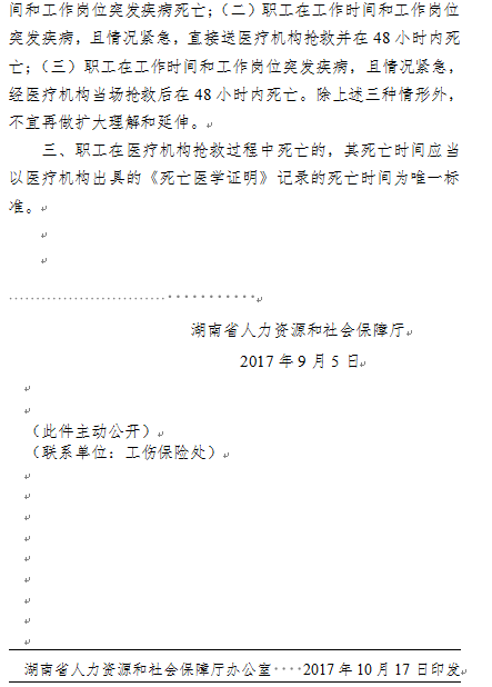 工傷保險(xiǎn)條例》第十五條第(一)項(xiàng)規(guī)定,“在工作時(shí)間和工作崗位,突發(fā)疾病死亡或者在48小時(shí)之內(nèi)經(jīng)搶救無(wú)效死亡的”視同工傷。為進(jìn)一步做好工傷認(rèn)定工作,統(tǒng)一全省工傷認(rèn)定情形掌握尺度,經(jīng)與省高級(jí)人民法院、省政府法制辦溝通銜接,根據(jù)人力資源社會(huì)保障部對(duì)國(guó)務(wù)院法制辦復(fù)函意見(jiàn),近日,湖南省人社廳就該條款視同工傷情形的理解與執(zhí)行提出相關(guān)意見(jiàn)。