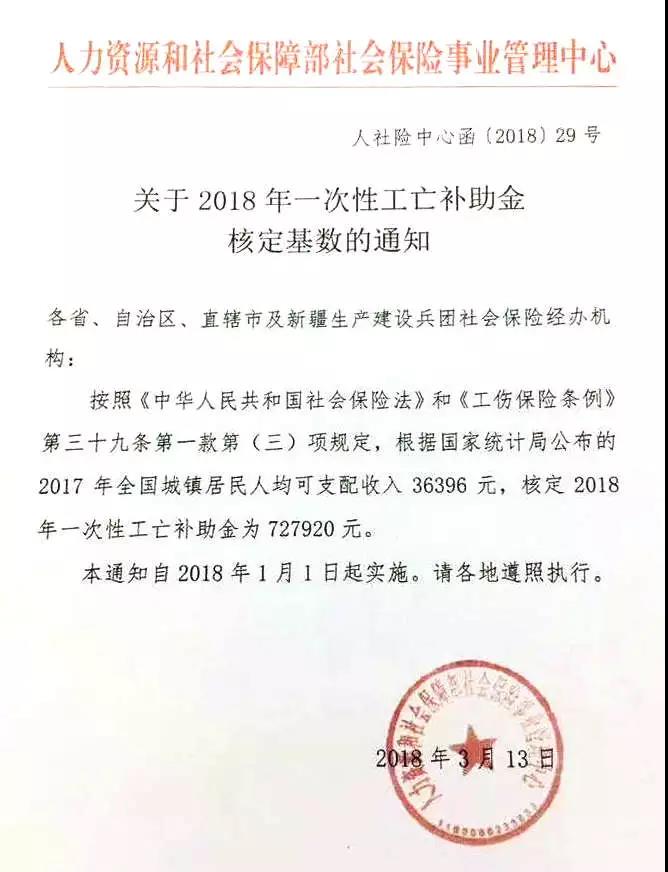 關于2018年一次性工亡補助金核定基數(shù)的通知
